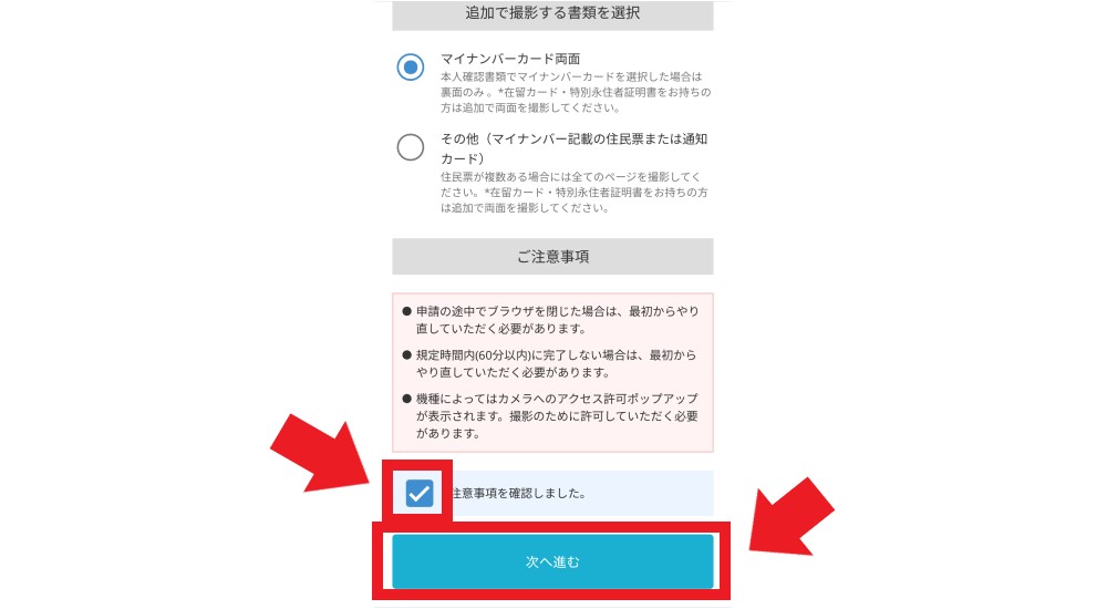 「注意事項を確認しました」にチェックを入れ、「次へ進む」をタップします。