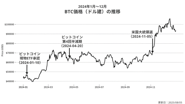 たとえば、ビットコイン価格は2024年に一時10%超の下落を記録しました。